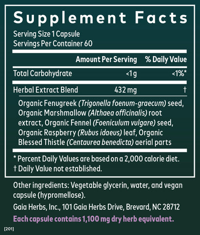 Sérblanda af lífrænu fenugreek (fræ), lífrænum marshmallow (rótarextrakt), lífrænu fennel (fræ), lífrænu hindberjalaufi, lífrænum blessed thistle (ofanjarðarhlutar), grænmetisglýseríni, vatni og vegan hylki (hypromellose).