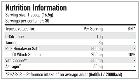 L-Citrulline, Taurine, Malic Acid, VitaCholine™ (Choline Bitartrate), Pink Himalayan Salt, Flavour, Anticaking agent (Silicon Dioxide), Sweetener (Sucralose), Astragin®, Natural Red Colour (Beetroot), Natural Blue Colour (Spirulina).