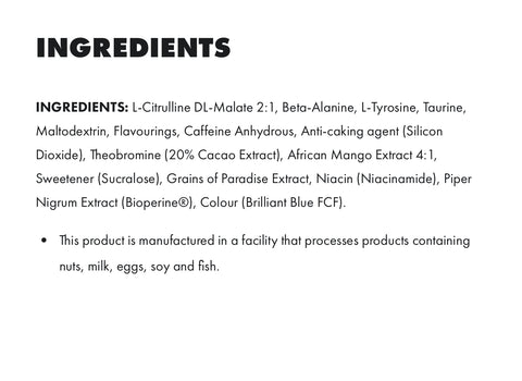 • 200mg koffín - Hrein og stöðug orka án "crashes" • 2,5g Citrulline Malate - Eykur úthald og vöðvapump • 500mg L-Tyrosine - Bætir einbeitingu og andlega fókus • 100mg Theobromine - Viðheldur langvarandi orku
