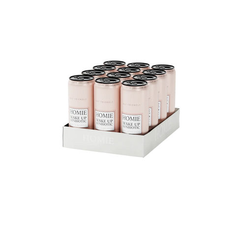Wake Up Synbiotic Pink Grapefruit frá Homie er ekki bara venjulegur orkudrykkur – þessi orkudrykkur sameinar koffín, lifandi mjólkursýrugerla, reishi sveppi, kíkórótartrefjar og úrval vítamína og steinefna með fersku pink greipaldabragði.